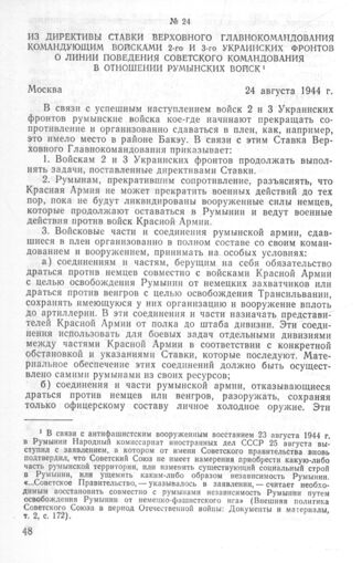Из директивы Ставки Верховного Главнокомандования командующим войсками 2-го и 3-го Украинских фронтов о линии поведения советского командования в отношении румынских войск. 24 августа 1944 г. // Печ. по архиву.