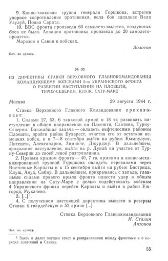 Из директивы Ставки Верховного Главнокомандования командующему войсками 2-го Украинского фронта о развитии наступления на Плоешти, Турну-Северин, Клуж, Сату-Маре. 29 августа 1944 г. // Печ. по архиву.