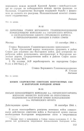 Из директивы Ставки Верховного Главнокомандования командующему войсками 3-го Украинского фронта о сосредоточении одного стрелкового корпуса и перебазировании авиации в район Софии. 13 сентября 1944 г.