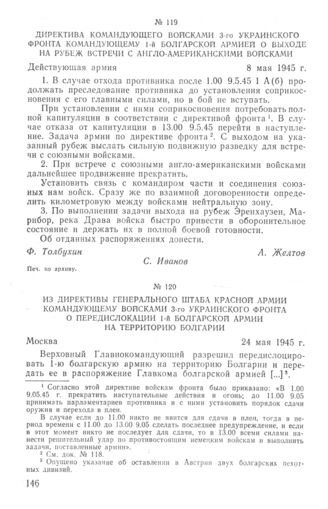 Директива командующего войсками 3-го Украинского фронта командующему 1-й болгарской армией о выходе на рубеж встречи с англо-американскими войсками. 8 мая 1945 г. // Печ. по архиву.