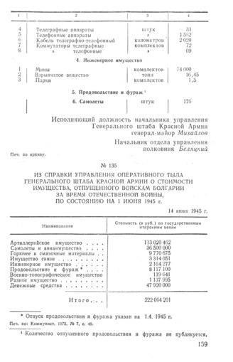 Из справки Управления оперативного тыла Генерального штаба Красной Армии о стоимости имущества, отпущенного войскам Болгарии за время Отечественной войны, по состоянию на 1 июня 1945 г. 14 июня 1945 г. // Печ. по: Коммунист, 1975, № 7. с. 49.