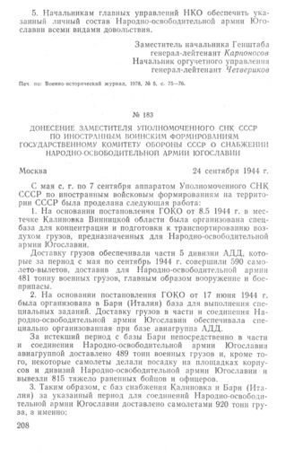 Донесение заместителя уполномоченного СНК СССР по иностранным воинским формированиям Государственному Комитету Обороны СССР о снабжении Народно-освободительной армии Югославии. 24 сентября 1944 г. // Печ. по архиву.