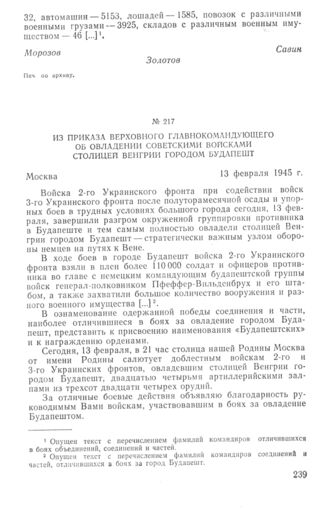Из приказа Верховного Главнокомандующего об овладении советскими войсками столицей Венгрии городом Будапешт. 13 февраля 1945 г. // Печ. по: Известия, 1945, 14 февр.