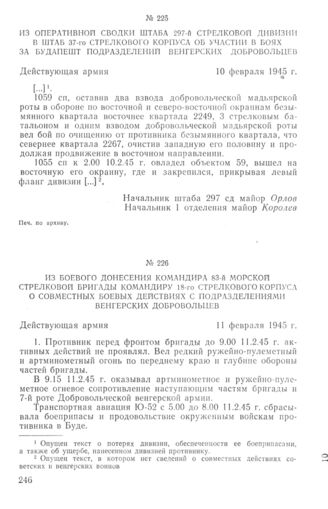 Из боевого донесения командира 83-й морской стрелковой бригады командиру 18-го стрелкового корпуса о совместных боевых действиях с подразделениями венгерских добровольцев. 11 февраля 1945 г. // Печ. по архиву.