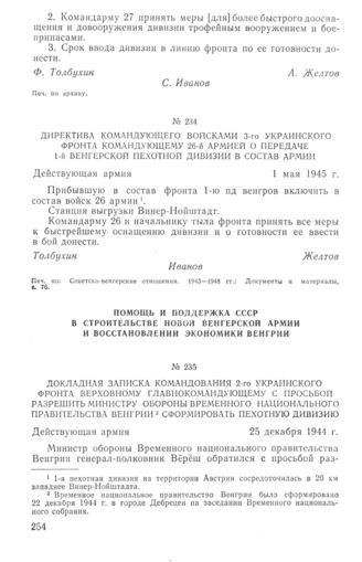 Докладная записка командования 2-го Украинского фронта Верховному Главнокомандующему с просьбой разрешить министру обороны Временного национального правительства Венгрии сформировать пехотную дивизию. 25 декабря 1944 г. // Печ. по архиву.
