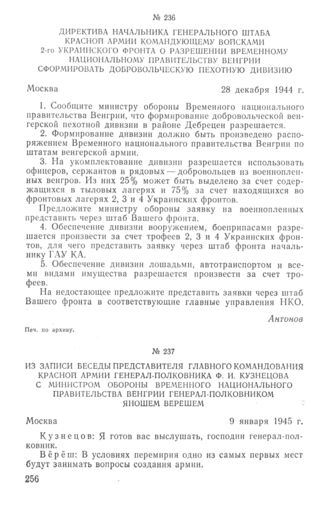 Директива начальника Генерального штаба Красной Армии командующему войсками 2-го Украинского фронта о разрешении Временному национальному правительству Венгрии сформировать добровольческую пехотную дивизию. 28 декабря 1944 г. // Печ. по архиву.