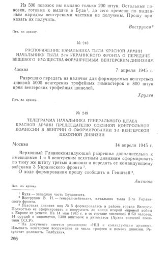 Распоряжение начальника тыла Красной Армии начальнику тыла 2-го Украинского фронта о передаче вещевого имущества формируемым венгерским дивизиям. 7 апреля 1945 г. // Печ. по архиву.