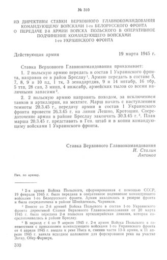 Из директивы Ставки Верховного Главнокомандования командующему войсками 1-го Белорусского фронта о передаче 2-й армии Войска Польского в оперативное подчинение командующего войсками 1-го Украинского фронта. 19 марта 1945 г. // Печ. по архиву.