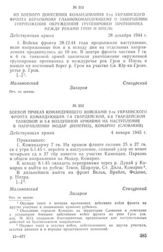 Из боевого донесения командования 2-го Украинского фронта Верховному Главнокомандующему о завершении уничтожения окруженной группировки противника между реками Грон и Ипель. 28 декабря 1944 г.