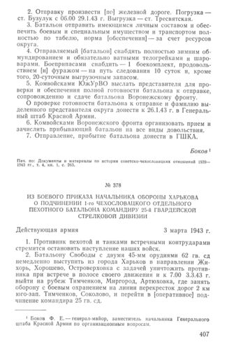 Из боевого приказа начальника обороны Харькова о подчинении 1-го чехословацкого отдельного пехотного батальона командиру 25-й гвардейской стрелковой дивизии. 3 марта 1943 г. // Печ. по архиву.