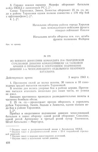 Из боевого донесения командира 25-й гвардейской стрелковой дивизии командующему 3-й танковой армией о прибытии в оперативное подчинение дивизии 1-го чехословацкого отдельного пехотного батальона. 3 марта 1943 г. // Печ. по: Документы и материалы по истории советско-чехословацких отношений 1939—1943 гг., т. 4, кн. 1, с. 274.