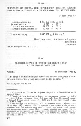 Ведомость на переданное норвежской военной миссии имущество за период с 10 декабря 1944 г. по 1 апреля 1945 г. 14 мая 1945 г. // Печ. по: Коммунист, 1979, № 13, с. 83.