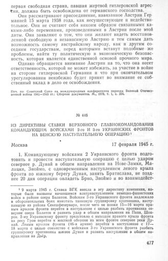 Из директивы Ставки Верховного Главнокомандования командующим войсками 2-го и 3-го Украинских фронтов на Венскую наступательную операцию. 17 февраля 1945 г.