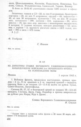 Из директивы Ставки Верховного Главнокомандования командующему войсками 3-го Украинского фронта на освобождение Вены. 1 апреля 1945 г. // Печ. по архиву.