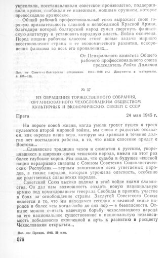Из обращения торжественного собрания, организованного Чехословацким обществом культурных и экономических связей с СССР. 24 мая 1945 г. // Печ. по: Правда. 1946, 25 мая.