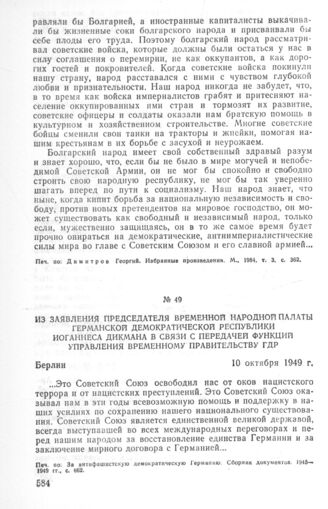 Из заявления председателя Временной народной палаты Германской демократической республики Иоганнеса Дикмана в связи с передачей функций управления Временному правительству ГДР. 10 октября 1949 г. // Печ. по: За антифашистскую демократическую Германию. Сборник документов. 1945—1949 гг., с. 662.