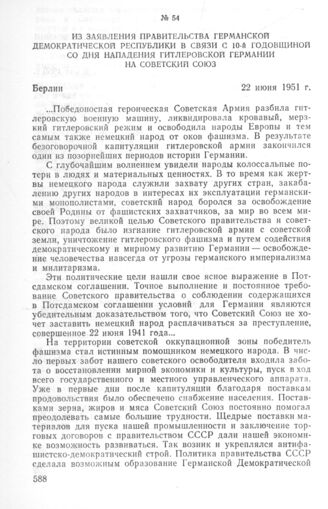 Из заявления правительства Германской демократической республики в связи с 10-й годовщиной со дня нападения гитлеровской Германии на Советский Союз. 22 июня 1951 г.