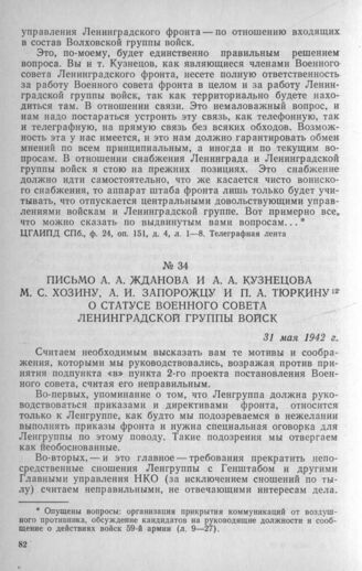 Письмо А. А. Жданова и А. А. Кузнецова М. С. Хозину, А. И. Запорожцу и П. А. Тюркину о статусе Военного совета Ленинградской группы войск. 31 мая 1942 г. // ЦГАИПД СПб., ф. 24, оп. 151, д. 4, л. 74—76. Отпуск.