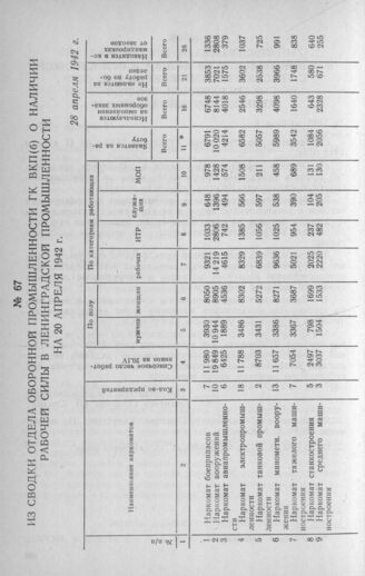 Из сводки отдела оборонной промышленности ГК ВКП(б) о наличии рабочей силы в ленинградской промышленности на 20 апреля 1942 г. 28 апреля 1942 г.