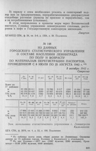 Из данных Городского статистического управления о составе населения Ленинграда по полу и возрасту по материалам перерегистрации паспортов, проведенной с 8 июля по 25 августа 1942 г. 5 октября 1942 г.