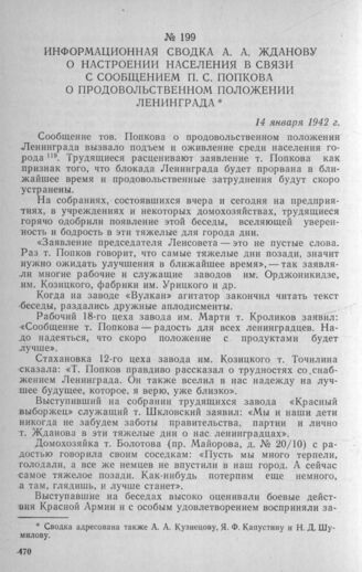 Информационная сводка А. А. Жданову о настроении населения в связи с сообщением П. С. Попкова о продовольственном положении Ленинграда. 14 января 1942 г. // ЦГАИПД СПб., ф. 24, оп. 2-в, д. 5760, л. 12—14. Подлинник.