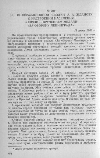 Из информационной сводки А. А. Жданову о настроении населения в связи с вручением медали «За оборону Ленинграда». 19 июня 1943 г. // ЦГАИПД СПб., ф. 24, оп. 2-в, д. 6258, л. 252—254. Подлинник.