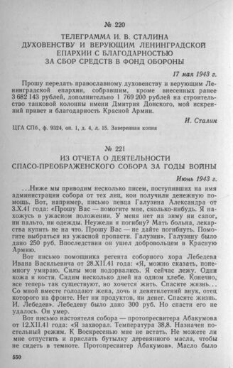 Телеграмма И. В. Сталина духовенству и верующим Ленинградской епархии с благодарностью за сбор средств в фонд обороны. 17 мая 1943 г.