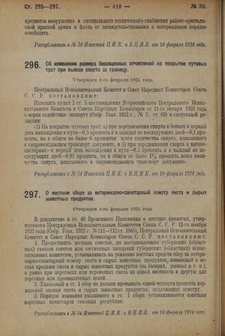 Декрет Центрального Исполнительного Комитета и Совета Народных Комиссаров. Об изменении размера безакцизных отчислений на покрытие путевых трат при вывозе спирта за границу. Утвержден 8-го февраля 1924 г.