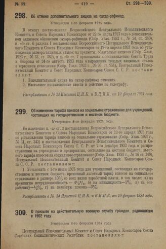 Декрет Центрального Исполнительного Комитета и Совета Народных Комиссаров. Об отмене дополнительного акциза на сахар-рафинад. Утвержден 8-го февраля 1924 г.
