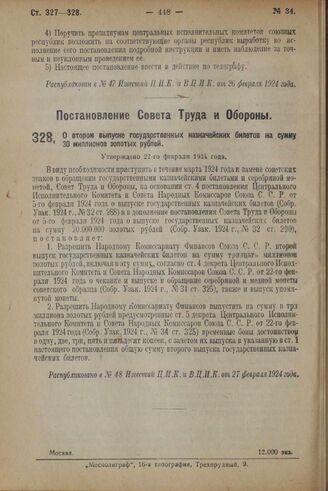 Постановление Совета Труда и Обороны. О втором выпуске государственных казначейских билетов на сумму 30 миллионов золотых рублей. Утверждено 22-го февраля 1924 г. // Распубликовано в № 48 Известий Ц.И.К. и В.Ц.И.К. от 27 февраля 1924 г.