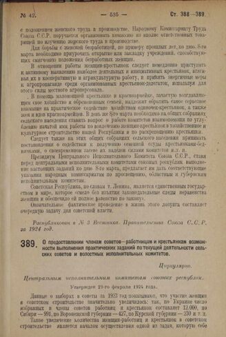 Декрет Центрального Исполнительного Комитета. О предоставлении членам советов — работницам и крестьянкам возможности выполнения практических заданий по текущей деятельности сельских советов и волостных исполнительных комитетов. Утвержден 29-го февраля 1924 г.