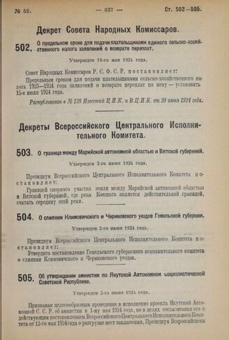 Декрет Всероссийского Центрального Исполнительного Комитета. О границе между Марийской автономной областью и Вятской губернией. Утвержден 2-го июня 1924 г.