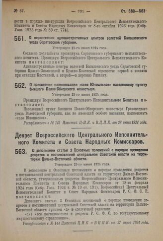 Декрет Всероссийского Центрального Исполнительного Комитета. О перенесении административных центров волостей Балашевского уезда Саратовской губернии. Утвержден 23-го июня 1924 г.