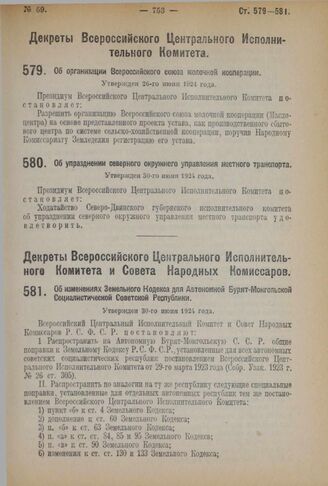 Декреты Всероссийского Центрального Исполнительного Комитета и Совета Народных Комиссаров. Об изменениях Земельного Кодекса для Автономной Бурят-Монгольской Социалистической Советской Республики. Утвержден 30-го июня 1924 г.