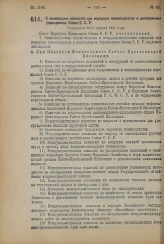 Декрет Совета Народных Комиссаров. О ликвидации комиссий при народных комиссариатах и центральных учреждениях Союза С С.Р. Утвержден 23-го апреля 1924 г.