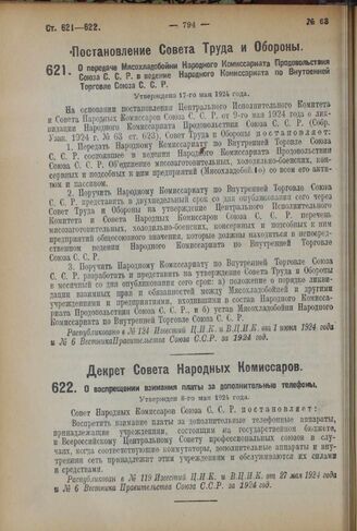 Декрет Совета Народных Комиссаров. О воспрещении взимания платы за дополнительные телефоны. Утвержден 8-го мая 1924 г. // Распубликовано в № 119 Известий Ц.И.К. и В.Ц.И.К. от 27 мая 1924 г. и № 6 Вестника Правительства Союза С.С.Р. за 1924 г.