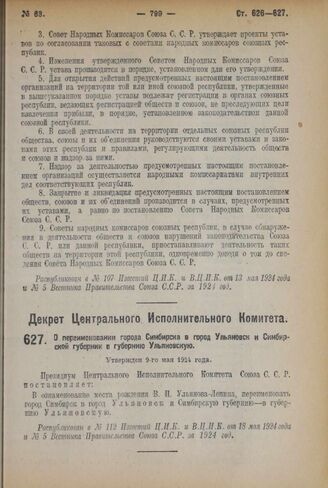 Декрет Центрального Исполнительного Комитета. О переименовании города Симбирска в город Ульяновск и Симбирской губернии в губернию Ульяновскую. Утвержден 9-го мая 1924 г. // Распубликован в № 112 Известий Ц.И.К. и В.Ц.И.К. от 18 мая 1924 г. и № 5 Вестника Правительства Союза С.С.Р. за 1924 г.