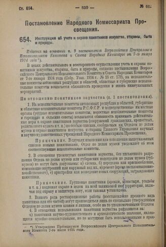 Постановление Народного Комиссариата Просвещения. Инструкция об учете и охране памятников искусства, старины, быта и природы. Издается на оснований п. 9 постановления Всероссийского Центрального Исполнительного Комитета и Совета Народных Комиссаро...