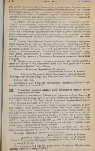 Декрет Всероссийского Центрального Исполнительного Комитета и Совета Народных Комиссаров. О повышении обложения гербовым сбором документов по торговым сделкам, совершаемым вне биржи. 4 января 1923 г.