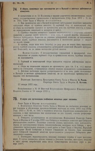 Постановление Совета Труда и Обороны. О мерах для организации снабжения железных дорог топливом. 17 января 1923 г. // Распубликовано в № 19 Известий Всероссийского Центрального Исполнительного Комитета Советов от 28 января 1923 г.