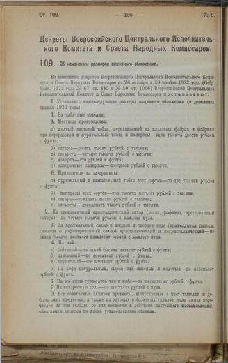Декрет Всероссийского Центрального Исполнительного Комитета и Совета Народных Комиссаров. Об изменении размеров акцизного обложения. 15 января 1923 г. // Распубликован в № 10 Известий Всероссийского Центрального Исполнительного Комитета Советов от 16 января 1923 г.