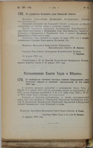 Постановление Совета Труда и Обороны. Об освобождении населения некоторых волостей Городищенского уезда Пензенской губернии от обложения трудгужналогом за 3-й период 1922 года. 15 февраля 1923 г.
