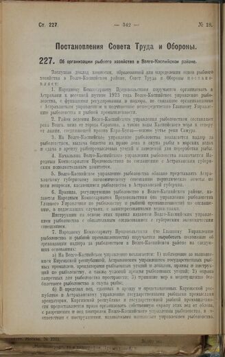 Постановление Совета Труда и Обороны. Об организации рыбного хозяйства в Волго-Каспийском районе. 20 февраля 1923 г.