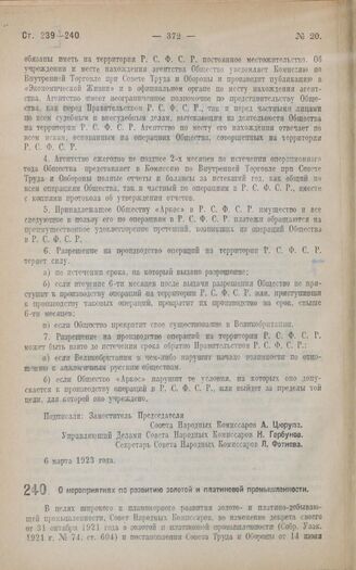 Декрет Совета Народных Комиссаров. О мероприятиях по развитию золотой и платиновой промышленности. 6 марта 1923 года