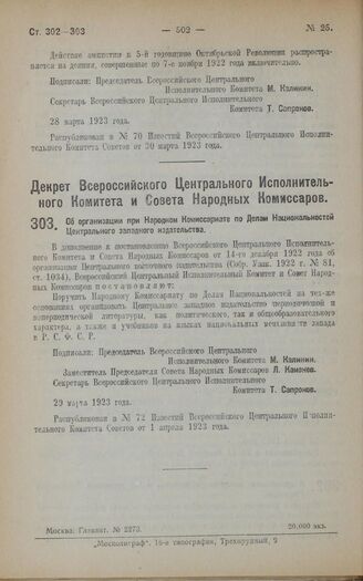 Декрет Всероссийского Центрального Исполнительного Комитета и Совета Народных Комиссаров. Об организации при Народном Комиссариате по Делам Национальностей Центрального западного издательства. 29 марта 1923 года