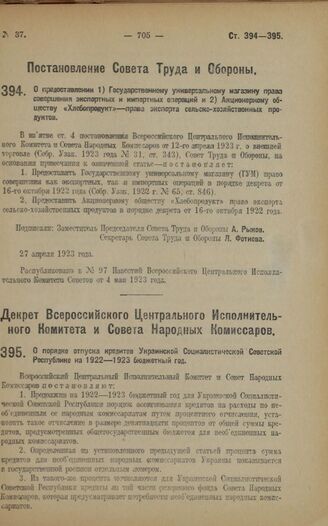 Декрет Всероссийского Центрального Исполнительного Комитета и Совета Народных Комиссаров. О порядке отпуска кредитов Украинской Социалистической Советской Республике на 1922—1923 бюджетный год. 27 апреля 1923 года