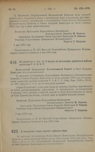 Декрет Всероссийского Центрального Исполнительного Комитета и Совета Народных Комиссаров. Об изменении п.«в» ст. 6 декрета об организации управления рыбным хозяйством Р.С.Ф.С.Р. 3 мая 1923 года // Распубликован в № 99 Известий Всероссийского Центрального Исполнительного Комитета Советов от 6 мая 1923 года.