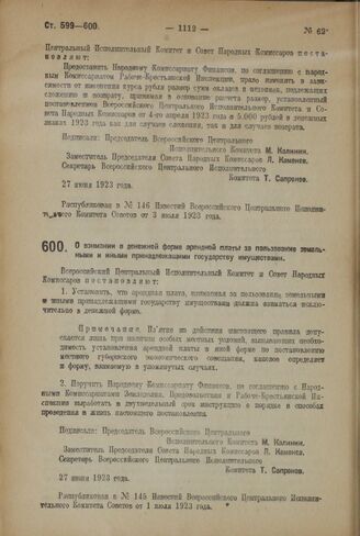 Декрет Всероссийского Центрального Исполнительного Комитета и Совета Народных Комиссаров. О взимании в денежной форме арендной платы за пользование земельными и иными принадлежащими государству имуществами. 27 июня 1923 года