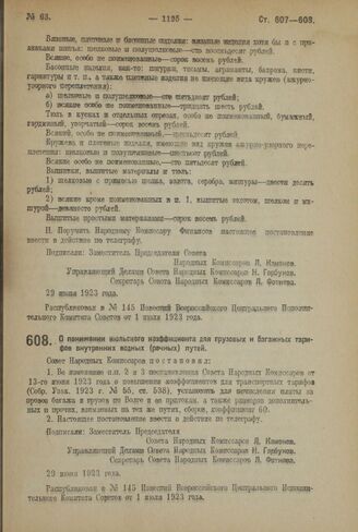 Декрет Совета Народных Комиссаров. О понижении июльского коэффициента для грузовых и багажных тарифов внутренних водных (речных) путей. 29 июня 1923 года