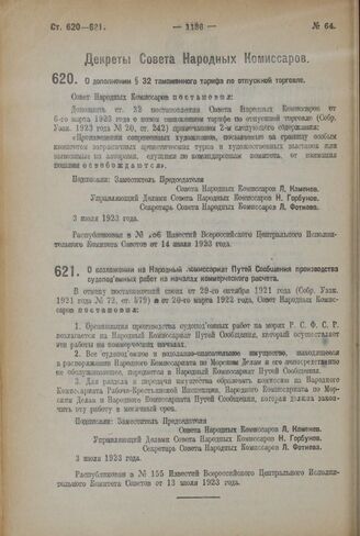 Декрет Совета Народных Комиссаров. О возложении на Народный комиссариат Путей Сообщения производства судоподъемных работ на началах коммерческого расчета. 3 июля 1923 года